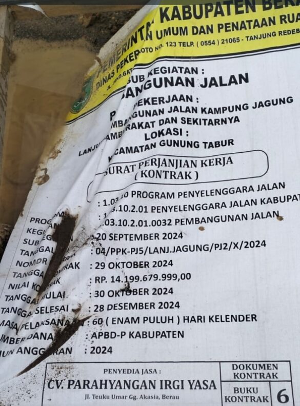 Pekerjaan pembangunan jalan kampung jagung Kecamatan Gunung Tabur, Kabupaten Berau, Provinsi Kalimantan Timur ( Kaltim) senilai Rp, 14.199.679.999, 00 dari Dinas Pekerjaan Umum dan Penataan Ruang ( PUPR) Kabupaten Berau, sesuai kontrak terhitung mulai kerja 30 Oktober 2024 dan selesai 28 Desember 2024 (60 hari) tapi sampai sekarang masih terlihat bekerja besar dugaan perusahan tersebut melakukan aktivitas diluar masa kontrak.