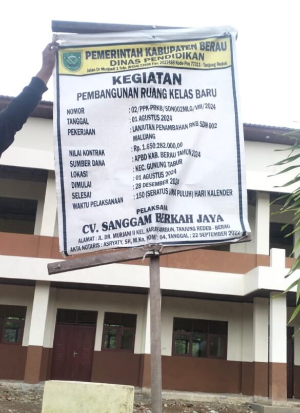Proyek pembangunan ruang kelas baru Sekolah Dasar Negeri (SDN) 002 Maluang, Kecamatan Gunung Tabur, Kabupaten Berau, Provinsi Kalimantan Timur (Kaltim) menuai sorotan dari berbagai pihak.