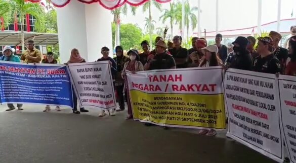 Aksi unjuk rasa kembali digelar masyarakat hukum adat lingkar Hak Guna Usaha (HGU) PT Budiduta Agramakmur (BDAM) terhadap keberadaan perusahaan tersebut di depan Kantor Bupati Kutai Kartanegara (Kukar) di Tenggarong, Senin (4/8/2025)